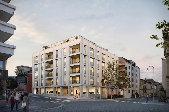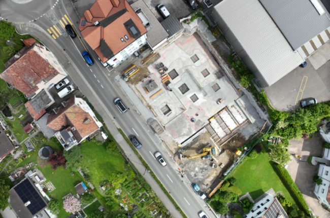 Umsetzung beim Neubau Central Rorschach Signalstrasse: Unterlagsböden, Balkone, Dachbegrünung und PV-Anlage.